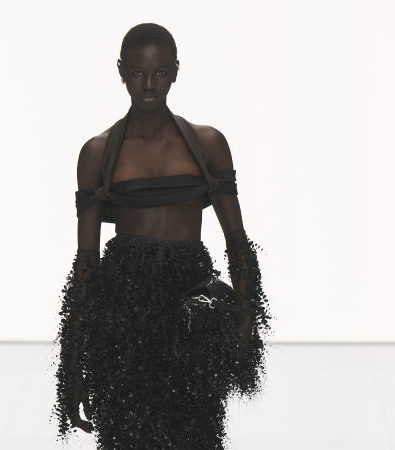 Ο creative director Kim Jones του Fendi για τη συλλογή Couture S’24 εμπνεύστηκε από τις φουτουριστικές προσεγγίσεις του αείμνηστου Karl Lagerfeld όταν υπηρετούσε τον οίκο. Στην πασαρέλα εμφανίστηκαν φιγούρες που φορούσαν κομμάτια από παγιέτες με βάρος, see through maxi φορέματα σε nude χρώματα και γλυπτικά, ιδιαίτερα σουτιέν-tops που συνδυάστηκαν με φούστες και με tailored παντελόνια.