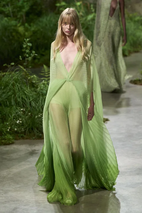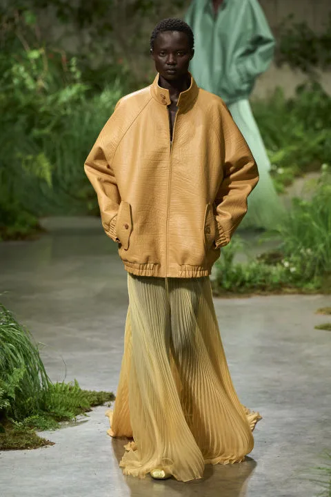 Τα κομψά υφάσματα ήταν το κλειδί σε όλη τη συλλογή, με διάφανες φούστες και φορέματα διακοσμημένα με κυκλικά διακοσμητικά. Η οργάντζα πήρε δραματικά σχήματα σε ροζ, πράσινα και μπλε, σε συνδυασμό με καρό παλτό σε χρώμα μπιζελιού αλλά φορέθηκε και κάτω από φαρδιά δερμάτινα μπουφάν σε εντυπωσιακούς τόνους ηλιοβασιλέματος.