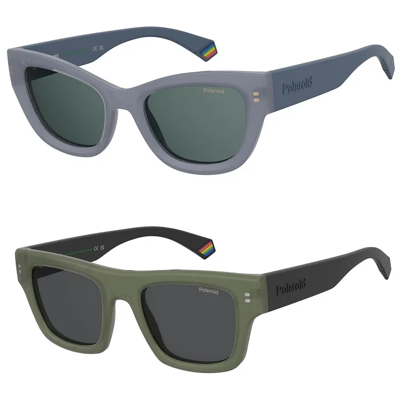 ΓΥΑΛΙΑ ΗΛΙΟΥ PLD 6239/S/X: γυαλιά ηλίου σε έντονο ορθογώνιο σχήμα από οικολογικό πολυκαρβονικό υλικό, κατάλληλα και για οφθαλμικούς φακούς, στολισμένα με μεταλλική λεπτομέρεια, με μαλακούς βραχίονες που φέρουν το λογότυπο Polaroid και καταλήγουν στη λεπτομέρεια Rainbow από καουτσούκ στα ακροβραχιόνια. Χρωματική παλέτα: Γαλακτερό λιλά με ματ λιλά βραχίονες και γκρι φακούς, Μαύρο με ματ μαύρους βραχίονες και γκρι φακούς, Γαλακτερό μπλε με ματ μπλε βραχίονες και μπλε φακούς, Γαλακτερό ροζ με ματ ροζ βραχίονες και μπλε φακούς, Γαλακτερό χακί με ματ πράσινους βραχίονες και μπλε φακούς, Γαλακτερό ροζ με ματ ροζ βραχίονες και βιολετί φακούς.