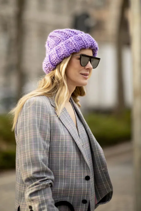 Η Officine Générale επέλεξε το ton sur ton, έτσι το μάλλινο καπέλο με ραβδώσεις προσαρμόζεται στο σχήμα του προσώπου, προσκολλάται τέλεια και καλύπτει το χτένισμα.